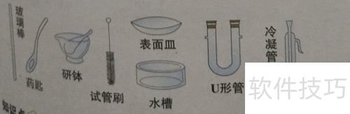 9、 其他用品:玻璃棒、药匙、研钵、试管刷、表面皿、水槽、U形管、冷凝管等。