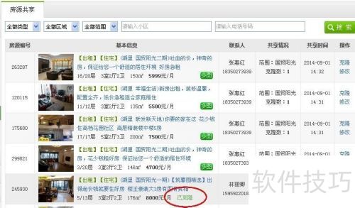3、 共享房源库列表会展示共享范围、克隆次数等信息,已克隆的房源会特别标注,防止经纪人重复操作。 若要克隆同事的房源,只需点击右侧的克隆按钮,具体所示。