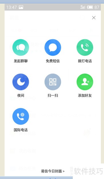 5、 在主界面右上角点击+号,可拨打免费电话,系统会回拨给你,记得接听,信号质量不错。此外还能发送免费短信至对方手机,不过易信会在信息后附带应用推广的小尾巴,但影响不大。
