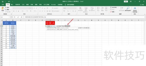 5、 在RANDBETWEEN函数中填入最小值1和最大值11,共11人。公式为=INDEX(B2:B13,RANDBETWEEN(1,11)),从B2到B13中随机选取一个数值进行匹配。