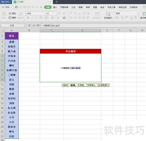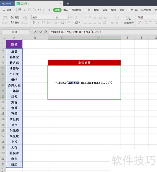 5、 选中所有名字后,继续输入函数,RANDBETWEEN(1,22)),这里的(1,22)代表名字序号的起止范围,所示。