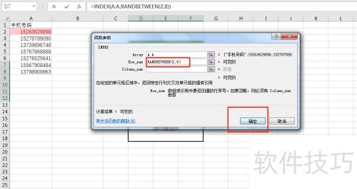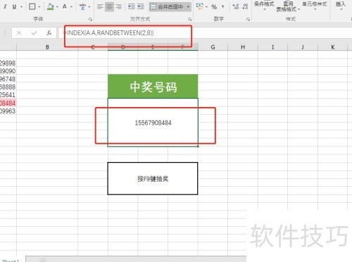 9、 从A2至A8单元格中随机抽取一个数据进行抽奖。
