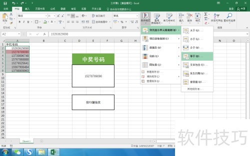15、 选中全部数据,依次点击开始、条件格式、突出显示单元格规则、等于。