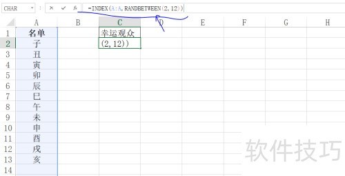 4、 在编辑栏输入公式:=INDEX(A:A,RANDBETWEEN(2,12)),即可随机引用A列中第2至第12行的某个单元格内容。
