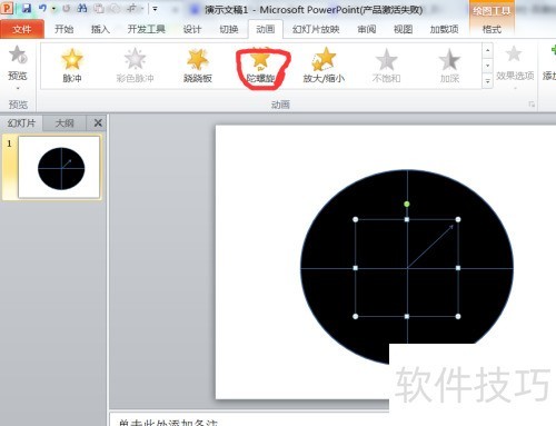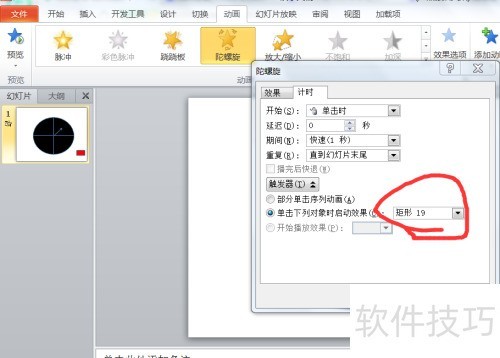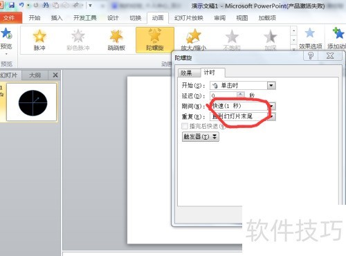 3、 第三,为指针添加动画,选择陀螺旋效果。然后打开动画窗格,将速度设为快速,重复选项设为持续到幻灯片结束。