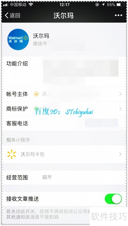 1、 打开微信,找到沃尔玛公众号。若未关注,点击关注;若已关注,直接进入。