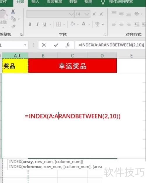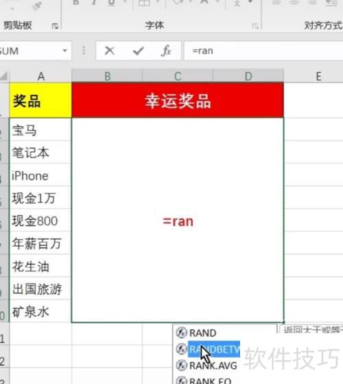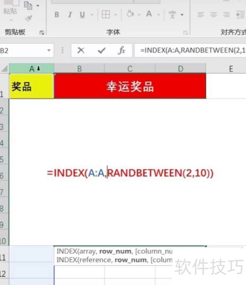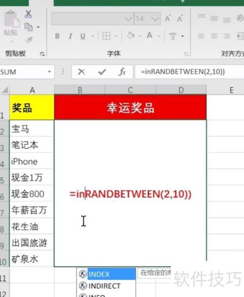 3、 在幸运奖品单元格点击输入/randbetween函数,因奖品为2-10,故填入(2,10),最后...
