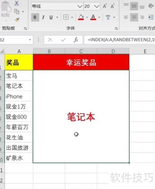 5、 按下回车键,选中单元格并按住F9,奖品会持续滚动;松开按键,滚动即停,显示所得奖品。