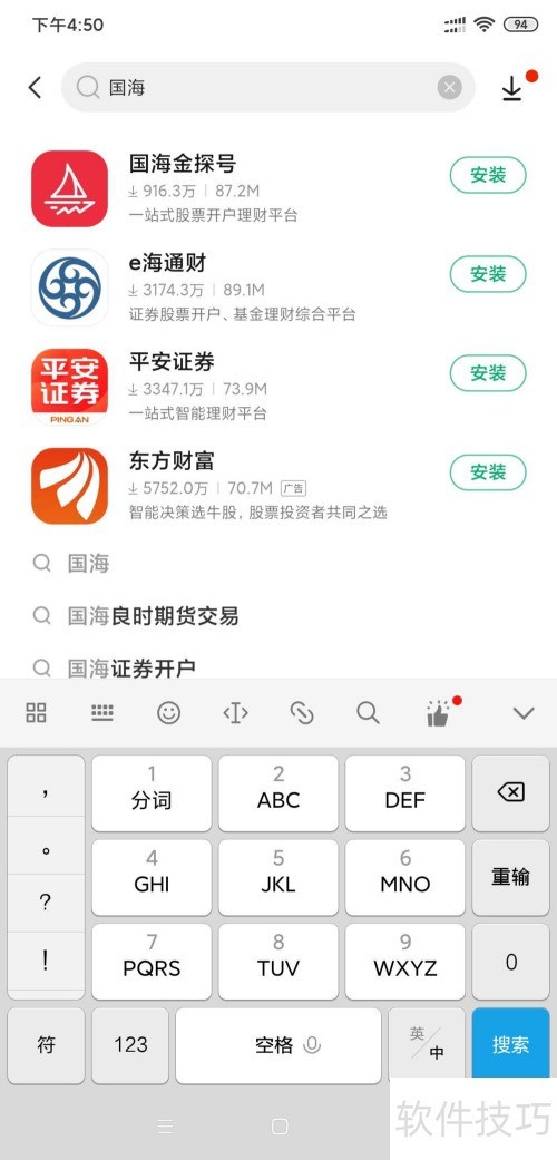 1、 第一步:打开手机应用商店,搜索国海金探号,所示。