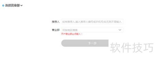 7、 第七步:选择开户营业部,如有推荐人则输入其编号,若无推荐人可跳过此项。