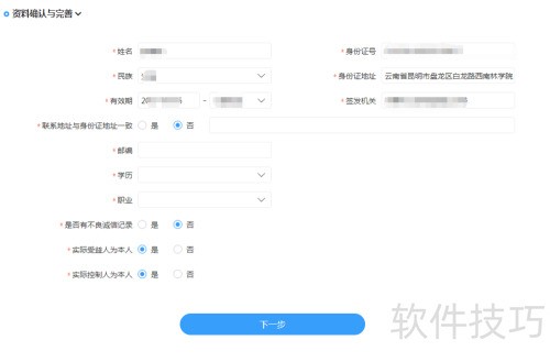 6、 第六步:核对个人信息,填写联系地址、邮编、职业、学历等,如信息错误请手动修改。带*号的为必填项。