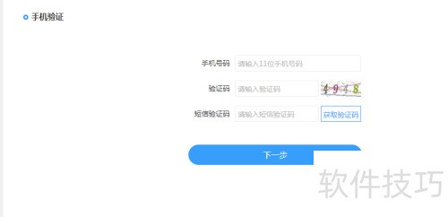 4、 第四步:输入手机号与图片验证码,点击获取验证码;收到短信验证码后输入,再点击下一步。