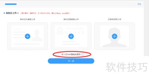 5、 第五步:上传身份证正反面,拍摄客户正面免冠照,确认是否为中国税收居民。