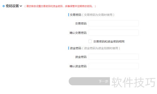 16、 第十三步:设定交易密码与资金密码。前者用于登录账户,后者用于证券转银行操作,两者可相同也可不同。