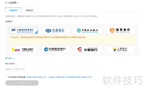 17、 步骤十四:选择三方存管银行,输入银行卡号与密码,签署存管协议。