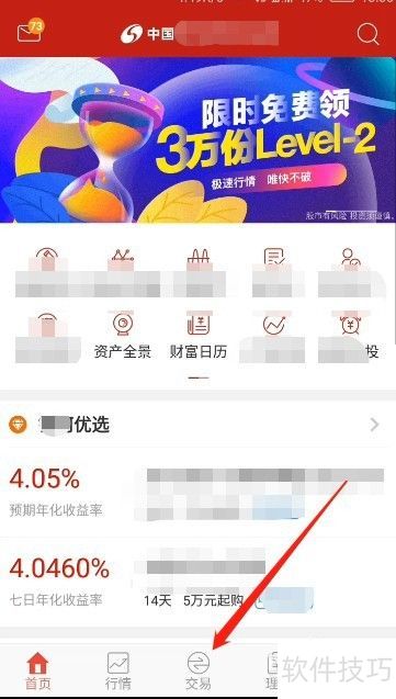 1、 打开银河证券APP,登录账号,点击底部交易选项。