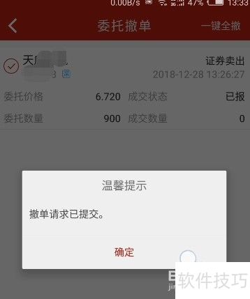 6、 弹出提示框显示撤单请求已提交,之后在委托撤单界面中将不再看到该交易单。