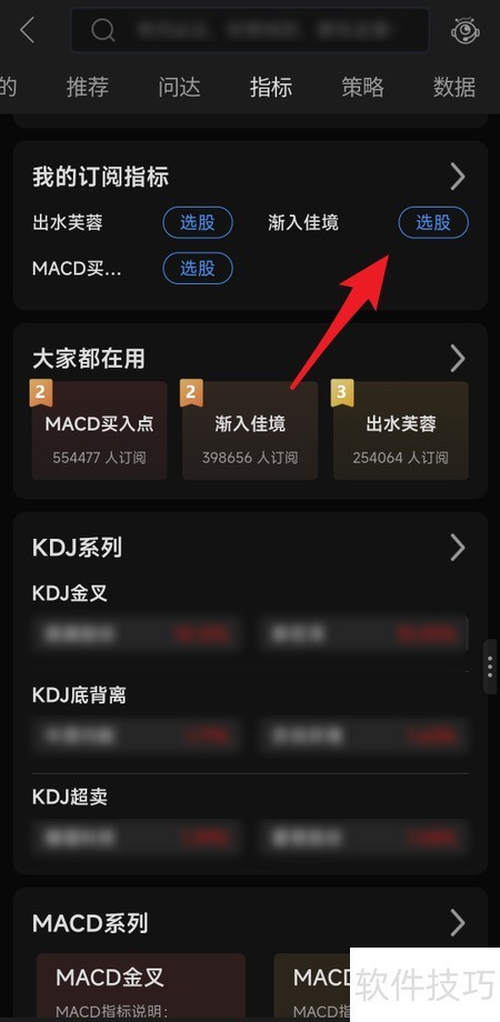 3、 在指标页面,点击渐入佳境右侧的选股按钮。
