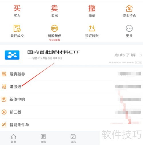 1、 首先,打开东方财富,进入交易界面后点击港股通选项。