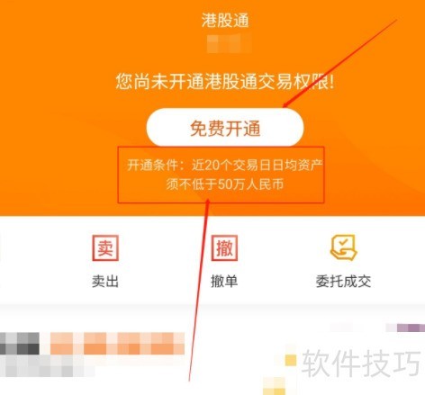 2、 第二步,在港股通页面点击免费开通。注意,近20个交易日日均资产不低于50万人民币才能满足开通条件。