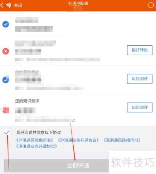 3、 第三步,在港股通开通页面,勾选我已阅读并同意协议,点击立即开通,。