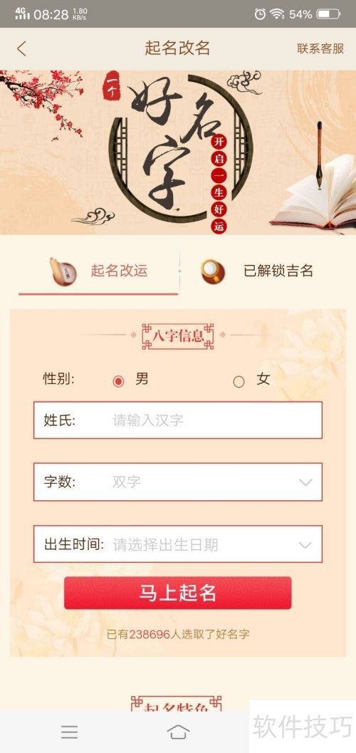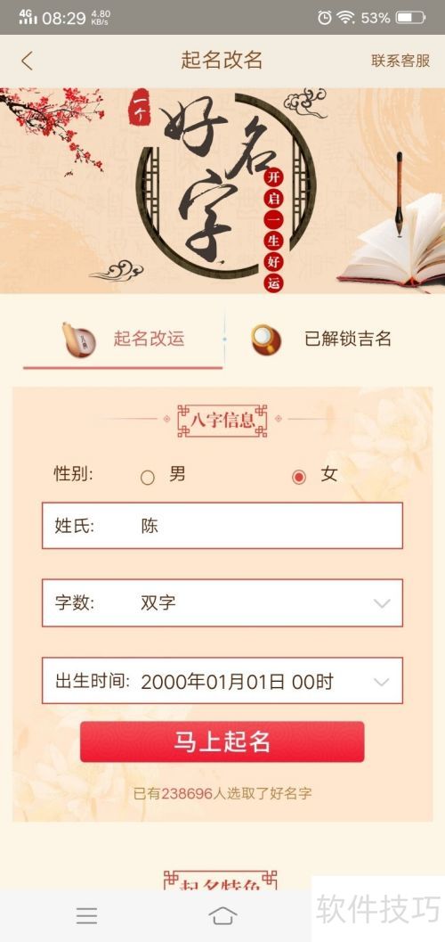 3、 输入宝宝姓氏与出生年月,可选择起一个或两个名字。点击下方马上起名按钮,即可获取名字,非常简单,快试试吧!