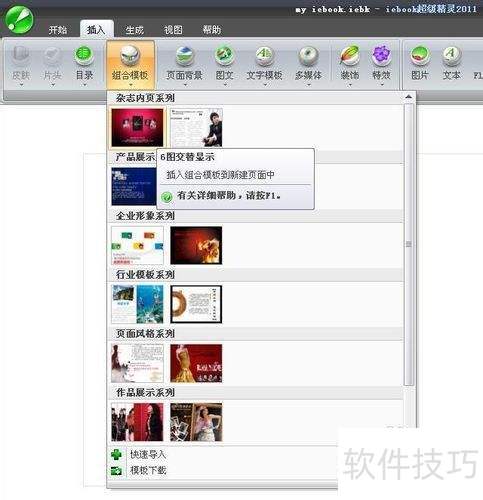 6、 更换封面与封底的方法相同,此处不再赘述。接下来开始编辑内页:在插入菜单中添加iebook电子杂志模板,选择一个组合模板插入,随后对模板进行修改,将其中的内容替换为自己的即可。以下是组合模板的插入步骤: