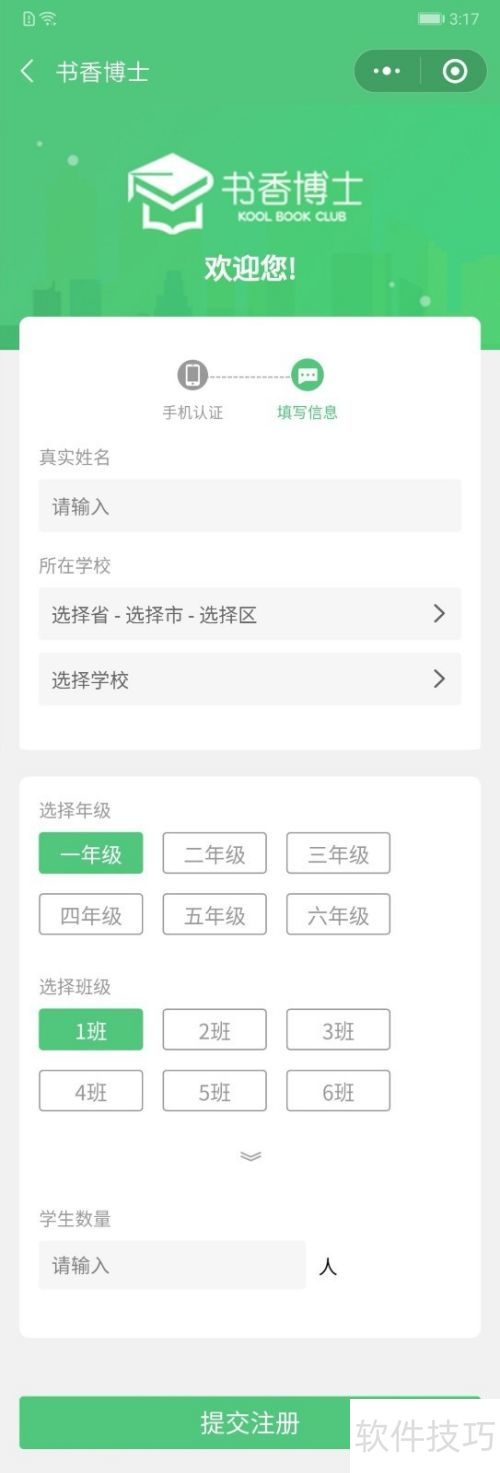 2、 依次填写姓名、学校、年级、班级,输入学生人数,点击提交注册。