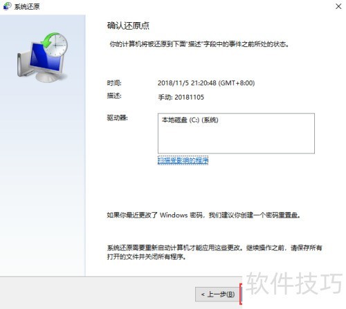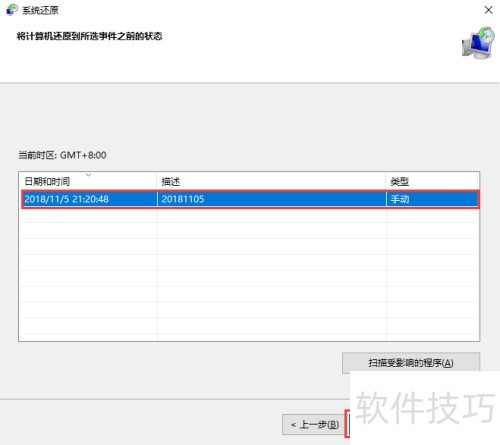 6、 选择之前手动创建的还原点,然后点击下一步。
