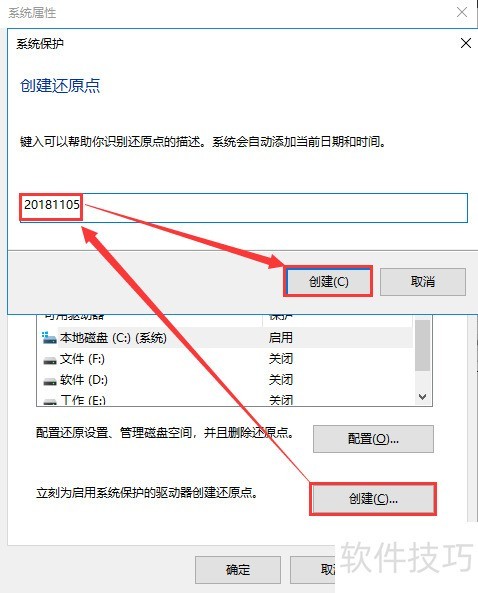 4、 在系统保护选项卡中再次点击创建,于弹出窗口输入还原点名称后确认。至此,还原点创建成功,同时相当于完成了注册表的备份操作。