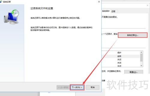 5、 接下来,我们来还原这个还原点。在系统保护窗口顶部找到系统还原选项,点击后,在弹出的窗口中选择下一步进行操作。