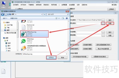 12、 完成注册表备份后,若需还原,可在备份注册表下方找到恢复注册表选项,点击其后的浏览按钮(...),在弹出窗口中选中之前备份的文件,点击打开,再点击恢复,待操作完成后点击确定即可完成还原。
