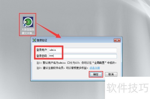 9、 系统安装完成后,返回桌面找到快捷方式,双击打开登录框,按提示输入初始账号密码,点击确定登录。