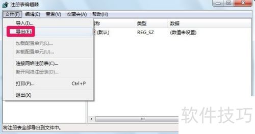 3、 点击文件菜单中的导出选项,对注册表进行备份操作。