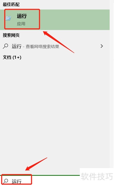 2、 在搜索栏输入运行,随后点击运行工具,参照下图操作。