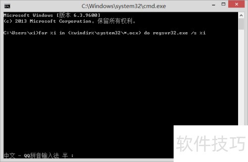 19、 将以下命令复制到窗口中执行:for %i in (%windir%system32*.ocx) do regsvr32.exe /s %i,以完成相关操作。