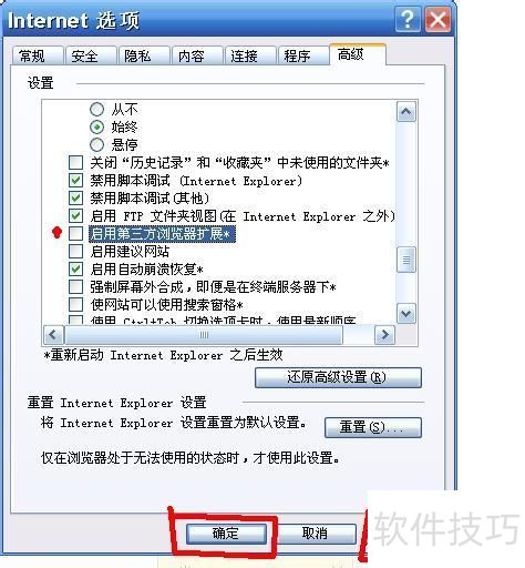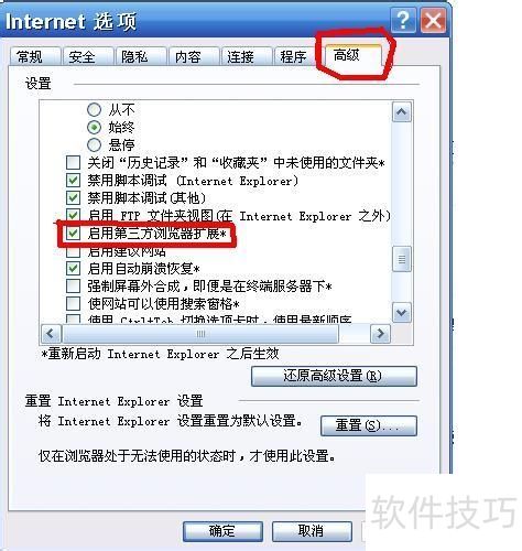 2、 进入选项卡,向下拖动,找到启用第三方浏览器扩展*,取消勾选。