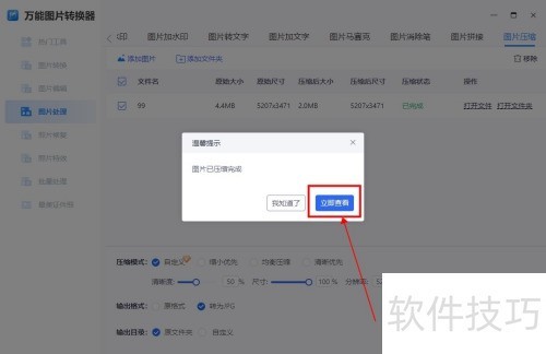 3、 第四步:页面显示温馨提示,表示压缩已完成。点击可打开图片,点击能定位电脑中压缩后图片的具体位置。