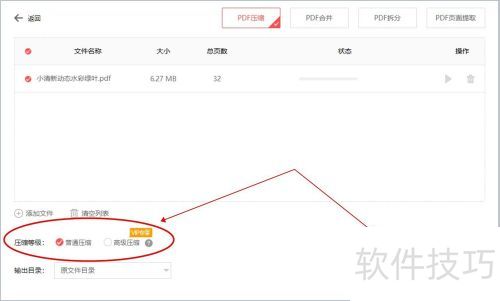 2、 在PDF压缩功能界面里,点击中间空白区域以添加需要压缩的PDF文件。文件添加完成后,设置压缩等级。默认为普通压缩模式,若想自定义压缩大小,可选择高级压缩,然后拖动压缩后大小下的滑块进行调整。设置完毕后,点击开始压缩按钮即可。这种方法能够满足用户将PDF文件压缩为不同大小的需求,灵活又高效。