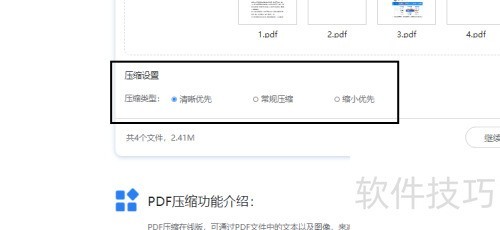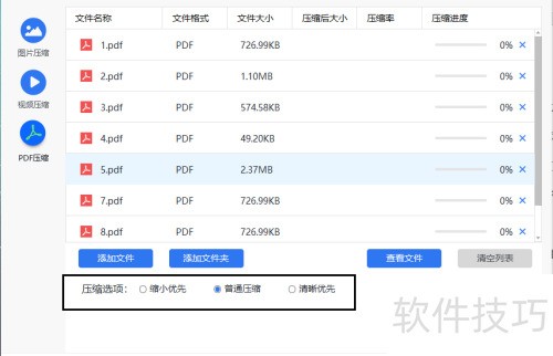 3、 添加文件后,找到压缩选项。PDF压缩有缩小优先、清晰优先和常规压缩,选择所需选项即可。