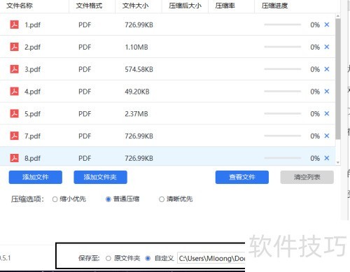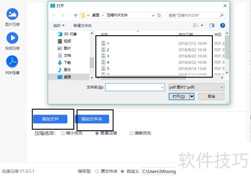 6、 在压缩页面中,找到添加文件与添加文件夹选项。点击添加文件,可将需压缩的PDF文件加入压缩页面;点击添加文件夹,则可将文件夹内所有文件一并添加至压缩页面。