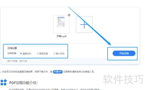 3、 在添加文件后,下方会有压缩选项,包括缩小优先、普通压缩和清晰优先。若想把PDF文件压得更小,选择缩小优先模式,这样输出的PDF文件体积会达到最小状态。
