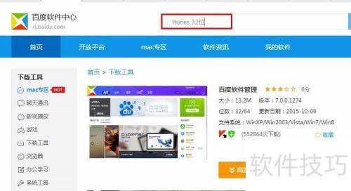 2、 打开百度软件中心主页,找到顶部的搜索栏,输入iTunes 32位,点击右侧搜索按钮进行查找。