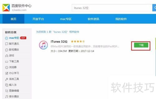3、 在主界面中部会显示搜到的 iTunes 32 位软件,点击右侧下载按钮,所示。
