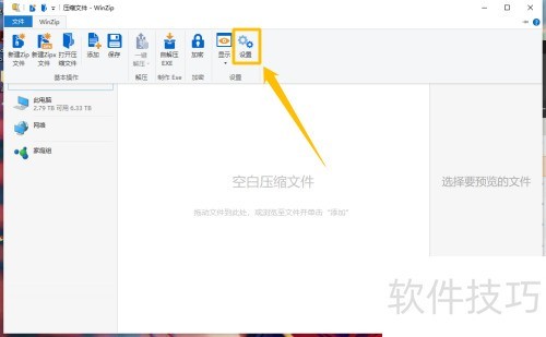 2、 单击上方WinZip菜单,在展开的功能区里选择设置图标。