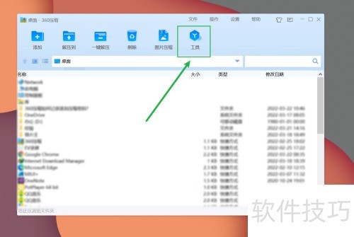 2、 打开360压缩主界面,选择并点击工具选项()。