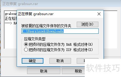 2、 在出现的窗口里,点击按钮,指定修复后文件的保存路径。接着,在中挑选一种修复后的文件格式。设置完毕后,点击确定,WinRAR将启动受...