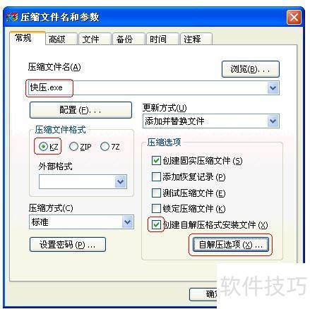 2、 选择KZ压缩格式,并勾选创建自解压安装文件。