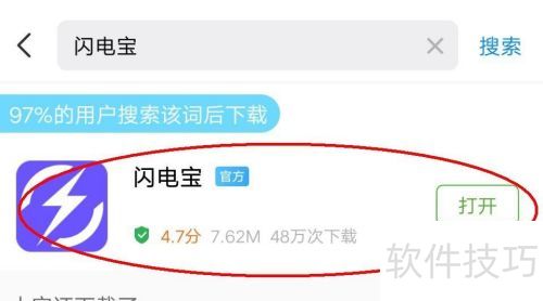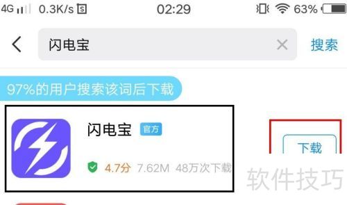 6、 在搜索结果里找到闪电宝,点击下载,应用商店会自动安装到手机,这样应该可以解决问题。
