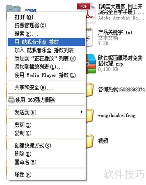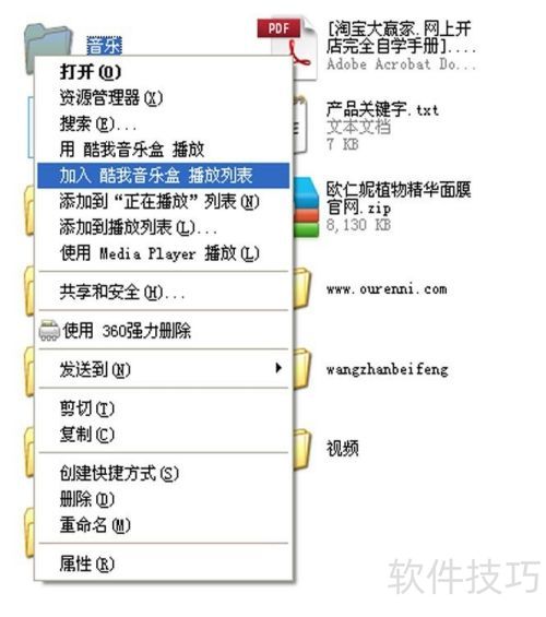 6、 第一步,右击要压缩的文件,从弹出的菜单中选择用酷我音乐播放或加入酷我音乐盒列表,二者任选其一即可。如果未安装酷我音乐,其他类似软件同样适用。建议尝试不同软件,或许会有意外惊喜。